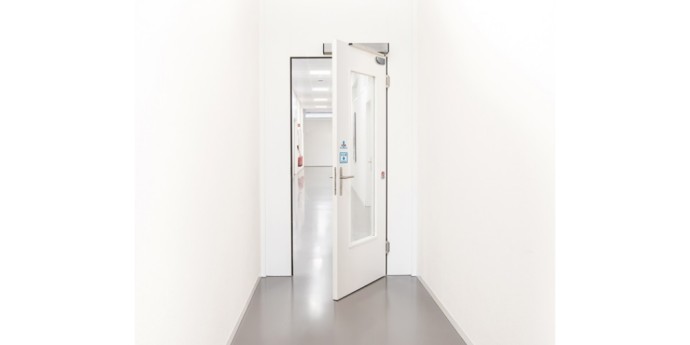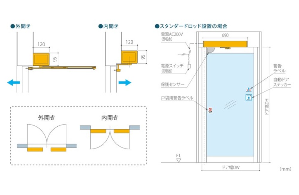 1) センサーやスイッチ、セキュリティー機器で開き戸を自動開閉します。また、ドアを軽く押すだけで動作させることも可能です。