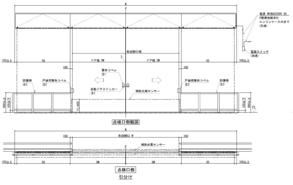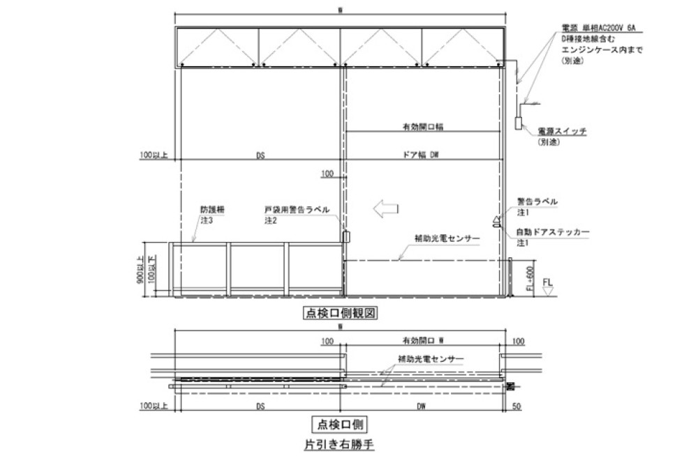 | 最大適応ドア単体質量 超重量扉 片引き:〜1000 引分け:〜500 | V-500SL 標準仕様納まり参考図(姿図) | V-500SL_standard_elevation | ダウンロード |